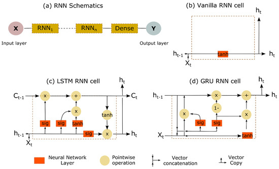 (a) Typical deep Recurrent Neural Network (RNN) architecture containing n RNN cells and a final dense layer [52,53,54]. The schematics of various RNN cells considered include: (b) vanilla RNN cell, (c) Long Short-Term Memory (LSTM) cell, and (d) Gated Recurrent Unit (GRU) cell. Note: is the input at any time t, is the cell state, and is the hidden state. Further note that the default activation function in RNN cells is tanh, while for recurrent steps in LSTM and GRU cells, the default recurrent activation function is sigmoid (sig).