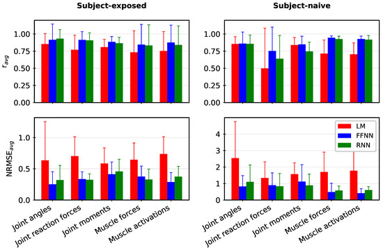 Average NRMSE values (NRMSE) and average Pearson’s correlation coefficient (r) for Linear Model (LM), Feed-Forward Neural Network (FFNN), and Recurrent Neural Network (RNN) predictions compared against the Musculoskeletal model outputs. The FFNN and RNN models consistently outperform the linear model. For a given output category, averaging is done over all output features and test trials (with the corresponding standard deviation shown as an error bar). See Supplementary Tables S1 and S2 for corresponding numerical data.