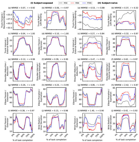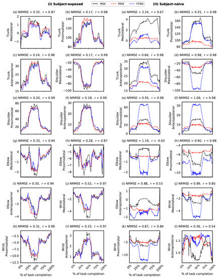 In general, we obtained excellent correspondence in both FFNN and RNN predictions with the ground truth, i.e., OMC-driven MSK output in both SE and SN scenarios (Figure 4 and Supplementary Tables S1–S3), with some notable exceptions, in particular, for SN settings. Some of these issues could be attributed to the lack of adequate training data (we have ), which we hope to address in future work by adding subjects and considering synthetic data augmentation using biomechanical models [37,56]. Note that the held-out trials were randomly selected for SE and SN settings from data with both inter- and intra-subject variability. This variability can be visualised in MSK outputs. For example, refer to Supplementary Figure S3 for joint reaction forces estimated by the MSK model. Despite this variability and small sample size (), the FFNN and RNN models show a high degree of agreement and low NRMSE values. The predictions could be further improved with a much larger sample size. Furthermore, the performance of FFNN and RNN models are comparable in this study despite the number of parameters in FFNN models being significantly greater than the corresponding RNN models (refer to Supplementary Figure S2). Such RNN architectures capturing the underlying MSK function using lesser model parameters can be trained easily. It would be worth exploring their performance for a much larger sample size.