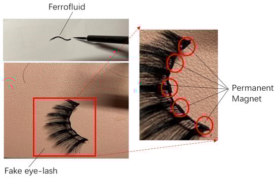 Ferrofluid was discovered by the National Aeronautics and Space Administration (NASA) in 1963. It is a colloidal suspension of ferro-magnetic nano-particles in a liquid medium. In the past few decades, the super-paramagnetism and miniaturisation features of ferrofluids have been the subjects of extensive research and scholarly articles []. They have been the subject of substantial study for electromagnetic engineering, mechanical engineering, and medical applications. With the rapid advancement of these cutting-edge technologies, the importance of ferrofluid research and development has grown [,,]. In this paper, ferrofluid is used as a magnetic medium for electromagnetic signal detecting. Due to the black colour and liquid form of the ferrofluid, it can function as an ’eye liner’ on human eyes as a make-up. Then, a fake eyelash with small permanent magnet attached is attracted by the ferrofluid and thus the fake eyelash is adsorbed firmly on the eyes. With the eye motion of blinking, the permanent magnet generates a variable magnetic field, which can generate an electromagnetic induction on a couple of passive coils winding on the glasses. The coils are designed to adapt the shape of the frame of the glasses, which makes the system wearable and the coils are made potentially invisible by integrating them into the frame of the glasses. The energy of the signal is harvested from the eye-blinking motion itself and does not require any external energy for continuous signal generating. Furthermore, each signal generated by the eye-blinking motion can be recorded for the treatment of eye diseases.