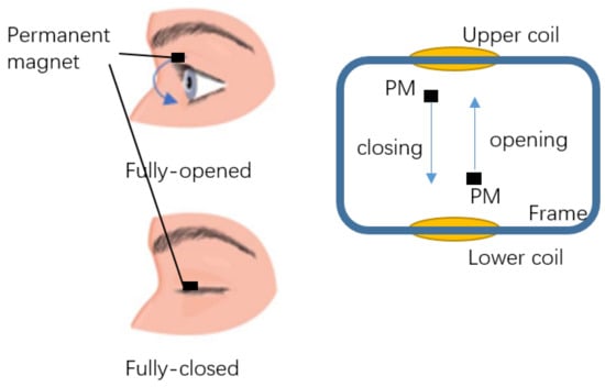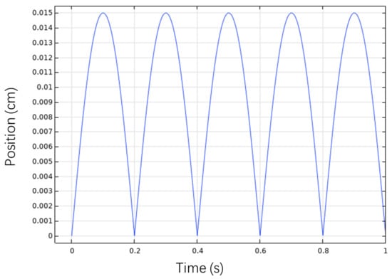 The vertical position of the permanent magnet in time domain is shown in Figure 11. A single eye-blinking duration for humans is from 0.2 s to 0.4 s. The magnet’s moving period is set to be 0.2 s to simulate a blink motion. As shown in Figure 11, position 0 represents the fully-closed eye motion and position 1.5 represents the fully-open eye motion. The permanent magnet moves from 0 to 1.5 periodically to simulate the continuous eye-blinking motion.