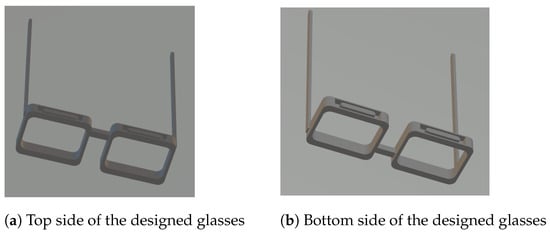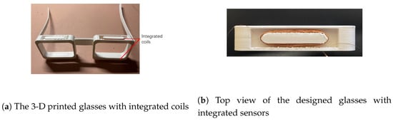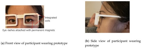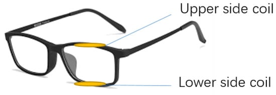The prototype of the designed glasses is shown in Figure 6. The top and bottom sides of the glasses frame are hollowed out for integrating the coils. The diameter of the wire used for winding coils is 0.1 . The length of the major axis and the minor axis of the coil are 30 and 5 , respectively. The thickness and height of the coils are 1 and 4 , respectively. Figure 6b shows the top view of how the coils are integrated into the frame of the glasses. Figure 7 shows the front view and the side view of participant wearing the glasses. The coils are integrated into the frame of the glasses and they are invisible from the front and the side view. In this work, each end of the coil wires is extended to connect with the signal processor Arduino. However, all the wires can be potentially integrated into the frame of the glasses to make the whole system invisible.