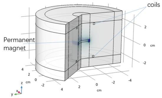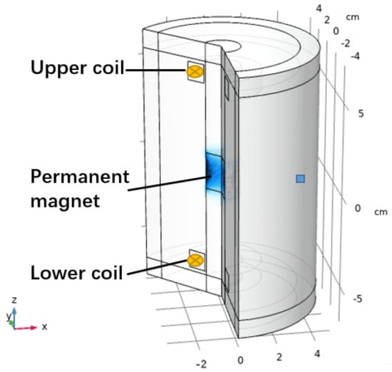 The coils are put on the top and bottom sides of the permanent magnet, as shown in Figure 5. The number of turns of the coils is set to be 500 and the cross section area of the coil wire is set to be , which is the same size as the wires selected in the experiments. The FEM solver is selected for transient analysis to calculate the induced signal while the permanent magnet is moving vertically. Both upper side coil and lower side coils have the same winding direction and the generated signals inside both coils are multiplied. The moving range of the permanent magnet is set from 0 to 3 . The work station is based on Windows 10 with 32 G RAM.