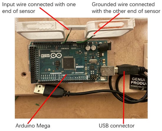 The ends of the sensors are connected to the input port and ground port of the Arduino Mega as shown in Figure 8. The signals generated from the sensors are collected by the input port of the Arduino Mega and the measured data are transmitted to the computer by a USB connector for data recording.