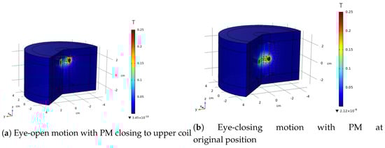 The magnetic induction intensity distribution of different permanent magnet positions is shown in Figure 10. Figure 10a shows the simulation result for when the permanent magnet is at position 1.5 , which simulates the position of the permanent magnet with the eye fully opened. Figure 10b shows the position of the permanent magnet where the eye is fully closed.