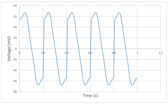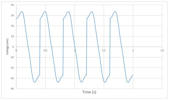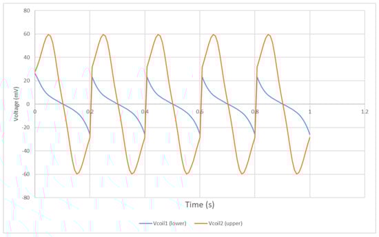 The induced signals inside the upper and lower coils are shown in Figure 12. The upper coil shows a stronger induced voltage than that of the lower coil, since the permanent magnet is moving on the upper space, which is closer to the upper coil and generates a stronger alternating magnetic field inside the upper coil. As the coils are wound and connected in the same direction, the induced signal can be multiplied into a larger signal for detection. Figure 13 shows the multiplied signal of the upper and lower coils. It generates a positive and a negative pulse during each period of 0.2 s, which can be monitored and recorded to calculate the eye-blinking frequency. Due to the limitation of Arduino, which is used to collect the generated signal, only one positive pulse can be read and recorded in the experimental result. However, it does not affect the monitoring of the eye-blinking motion as each positive pulse detected represents a single eye-blinking motion.