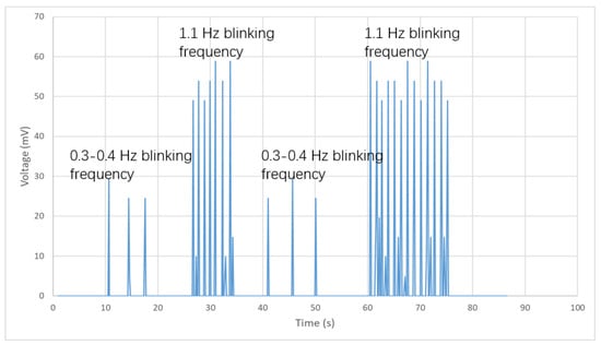 The experiment is designed to monitor the eye-blinking frequency. The participant wears the monitoring system and blinks quickly and slowly for a certain period. The measured result is shown in Figure 15. According to the simulation result, each blinking motion generates a positive and negative signal. However, due to the limitation of the Arduino Mega board, only positive signals can be read from the AnologRead port of the board. The AnologRead port of Arduino maps the input voltages between 0 and 5 V into integer values from 0 to 1023, which means the unit for each magnitude of the data is = 4.9 . As shown in Figure 15, the participant firstly blinks slowly for 10 s and the frequency measured is approximately 0.3–0.4 Hz. Then the participant stops blinking for 10 s and starts blinking quickly for another 10 s. The frequency measured for fast blinking is around 1.1 Hz. The participant repeats the slow and fast blinking for more data collecting and reduces the system error. Each blinking motion generates a pulse signal and it is used to calculate and record the eye-blinking frequency during the measurement. It is shown in the results that the magnitude of the fast blinking signal is larger than the slow blinking signal, which validates the finite element simulation results. This is because of the fact that, when the participant tries to blink faster, the permanent magnet attached on the fake eyelash moves faster and leads to a larger magnetic field change in a unit time. Thus the fast blinking behaviour generates a stronger signal on the coils than that of the slow blinking behaviour. The proposed wearable monitoring system is working with low cost and high accuracy.