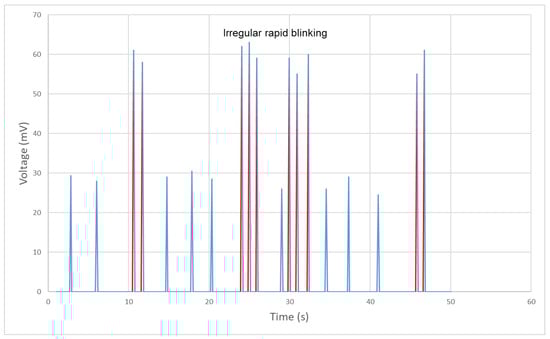 As shown in Figure 16, the blue signal represents a normal blinking pattern with a relatively low frequency and consistent speed. This results in a smaller magnitude of the signal compared to the irregular fast blinking pattern shown in red. This fast-blinking pattern is commonly observed in daily life, and can be caused by a variety of eye diseases such as dry eye syndrome, burning mouth syndrome, or even Parkinson’s disease. Due to the higher frequency and speed of the blinking, the magnitude of the signal is much larger than that of the normal blinking pattern, as illustrated in Figure 15. By accurately simulating these irregular blinking patterns, researchers can better understand the effects of different eye conditions and develop more effective treatments.