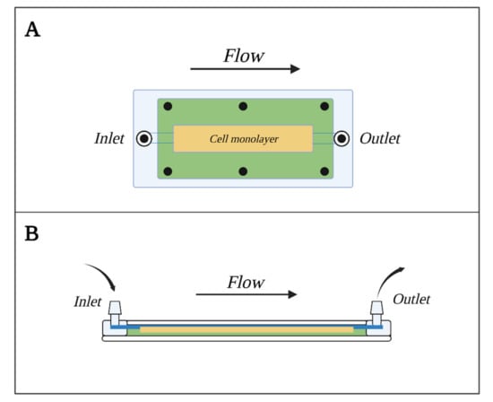 Figure 6. This consists of two plates, out of which the bottom one, usually made of glass, is coated with adhesion factors (collagen, fibronectins, etc.) and serves as the sowing area for cells. The top plate, made out of transparent polycarbonate, allows for visual observation. Plates are divided with a silica gasket, the width of which determines the diameter of the model’s flow channel. The channel that carries the medium responsible for forming the shear stress runs from the entry valve to the exit valve, parallel to the ECs layer. More advanced PPFC models are equipped with a semipermeable membrane, similar to the one found in Transwell inserts, that divides the channel into luminal and abluminal sides [