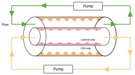 68]. On the luminal side, which envelopes the abluminal side, ECs are cultured. Originally, this model was developed based on the RBE4 cell line. The abluminal side carries culture medium conditioned by astrocyte culture. Each chamber is equipped with separate access ports that allow for perfusion and strict control over the culture environment and applied reagents (see