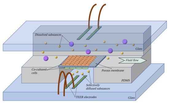 68]. Further advantages are relatively low cost, simplicity of construction and TEER measurement in real time. Notable is also the possibility of strict control over the parameters of the medium and its flow in both channels. High repeatability can also be attained when employing cell lines. The model allows for more precise studies on cocultures influenced by shear stress than DIV-BBB. It has proven useful as a tool for research on inflammatory mechanisms, barrier regeneration after exposure to histamine—a substance known for its BBB-disruptive properties [
