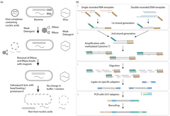 - Hasan, M.R.; Rawat, A.; Tang, P.; Jithesh, P.V.; Thomas, E.; Tan, R.; Tilley, P. Depletion of Human DNA in Spiked Clinical Specimens for Improvement of Sensitivity of Pathogen Detection by Next-Generation Sequencing. J. Clin. Microbiol. 2016, 54, 919–927. [Google Scholar] [CrossRef]