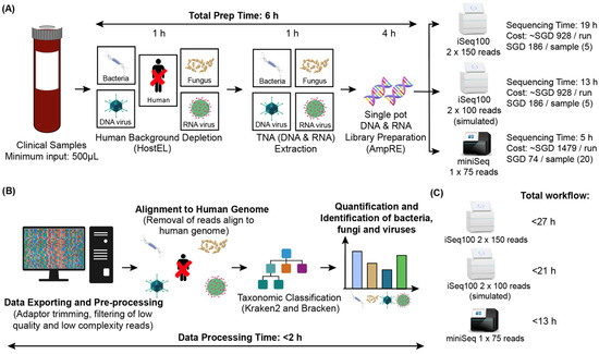 Schematic diagram of mNGS workflow using HostEL and AmpRE. (A) Workflow of mNGS using HostEL and AmpRE. A minimum of 500 µL of a clinical sample, such as plasma, is treated with HostEL to deplete human background before total nucleic acids (TNA) are extracted. TNA is then prepared into a sequencing library with AmpRE, followed by sequencing on the iSeq 100 (2 × 150; 2 × 100 simulated) or MiniSeq (1 × 100). The time required for each step and the cost of sequencing are indicated. (B) Workflow of data analysis. Sequenced data is exported in Fastq format from the sequencing platforms, and high quality and compatibility reads are selected. These sequences are then aligned to human genome, where the matched human sequences are removed. The reads of the pathogens (bacteria, fungus, and both DNA and RNA viruses) are then quantified and identified using KRAKEN2 and BRACKEN tools. The attached time for each step is included for reference. (C) Comparison of the different sequencing platforms on the total workflow time.