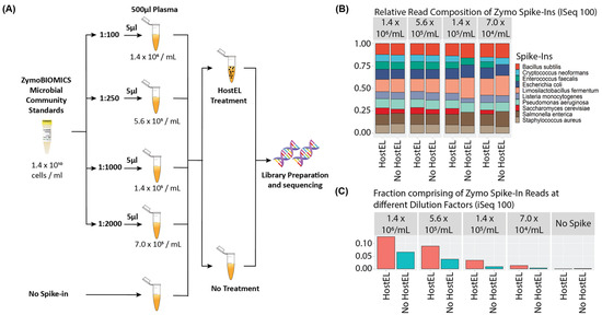 (A) Serial dilution of physiologically relevant levels of the ZymoBIOMICS Microbial Community Standard containing 8 bacteria and 2 yeast (Supplementary Table S1) to the estimated total microbial cells/mL concentration in plasma is completed before treatment with or without HostEL followed by TNA extraction and AmpRE library preparation. A total of 5 samples are batched and sequenced on the iSeq 100. (B) Relative contribution of microbial spike-ins towards non-human reads across different dilution factors of HostEL-treated and control samples mapping to the 10 organisms. The relative ratio of the organisms was preserved in the HostEL treated samples at all dilutions, while the control samples lost some organism reads at higher dilutions. (C) Fraction of reads that mapped to spiked-in microbes at different dilutions with or without HostEL treatment. HostEL-treated samples significantly increase the percentage of reads across all different dilution factors as compared to the non-treated samples. Detailed percentages of the reads are shown in Supplementary Table S2.