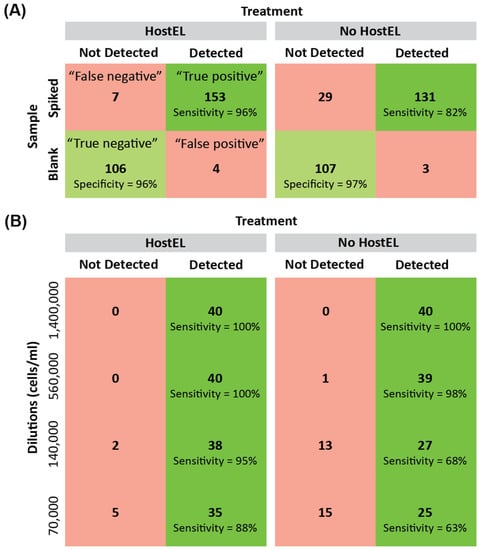 11 blank plasma and 4 repeats of each dilution of the 10 microbial standards (for a total of 40 expected spike-ins to be detected) were prepared and sequenced on the iSeq 100 with a high stringency cutoff to prevent false positives. Based on the 10 organisms spiked into the plasma, a diagnostic truth table was constructed (A) with and without HostEL treatment and further broken down into (B) detailed sensitivity at different dilutions.