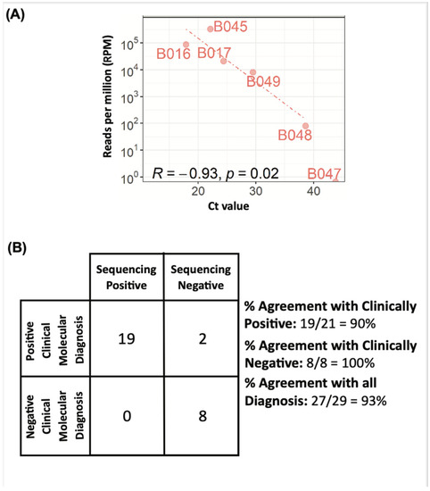 Clinical validation of our mNGS workflow was conducted on 42 patient plasma samples collected in compliance to IRB guidelines. These samples have previously been clinically diagnosed with nucleic acid tests to be positive (34 samples) or negative (8 samples) for pathogen infections (Table 1). To understand the correlation between sequencing workflow and the Ct values, and the LOD of the sequencing platforms, qPCR with targeted primers was conducted on 8 Hepatitis B samples diagnosed clinically with qPCR (Supplementary Table S3). Correlation plots were plotted with Ct values against the sequencing reads, and linear correlation was observed (Figure 5A). As we are targeting 100–500 k reads per sample, we can only confidently detect microbial sequences with an abundance of 1 in every 10 k reads. For samples with Ct~30, the relative abundance is about 1 in 10 k reads; thus, we have high confidence of our sensitivity up to a corresponding Ct value of 30 and below (Supplementary Table S4). When qPCR validation was also completed on all sequence-negative clinical samples as quality controls (Table 1) and some sequencing-positive samples as positive controls. qPCR was unable to detect any pathogen in 3 out of 13 of these samples, while the rest had a Ct ≥ 33. The high Ct values for these samples may be due to the following reasons: (i) pathogens may be present in a low level, and (ii) sample integrity may have been impacted, or samples had degraded due to long-term storage.