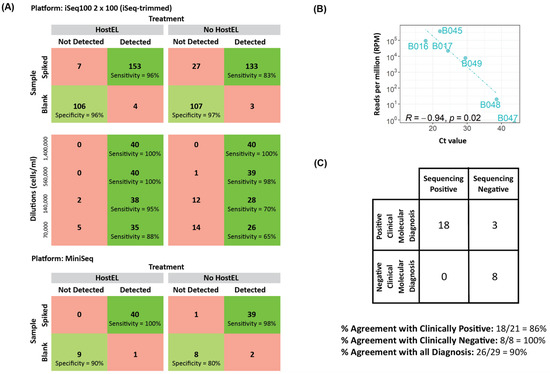 Correlation plots of Ct values against the sequencing reads were also plotted for the MiniSeq, and linear correlation was also observed (Figure 6B, Supplementary Table S4). With the patient samples and a Ct 33 cutoff, MiniSeq performed equivalently to the iSeq 100 run (Figure 6C). Our results suggest that the HostEL and AmpRE workflow is compatible with all three sequencing setup and can deliver rapid unbiased metagenomic sequencing results with shallow sequencing.