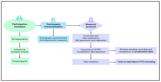 G*Power 3.1.9.2 software was used to calculate the sample size (G*Power ©; University of Düsseldorf, Düsseldorf, Germany). To analyze the differences before and after performing the task, we used a pre–post study that used the variable of time-to-task failure point (TTF) throughout the upper-limb isometric task, which found a significant correlation in performance fatigability (TTF) (p < 0.01) [42]. Thus, to achieve a statistical confidence of 95%, with a 2-tailed hypothesis test and a large effect size of 0.90, an α-error of 0.05, and a power of analysis of 0.80 (β error = 20%) were chosen. The result achieved was 18 subjects. Keeping in mind the possibility of loss to follow up, 39 subjects were recruited.