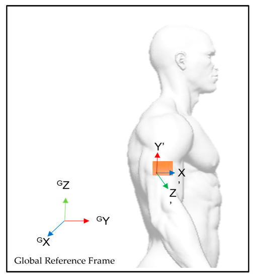 The IMU was placed on the external side of the humerus of the dominant arm so that its reference coordinate system had the X-axis pointing forward, the Y-axis pointing upwards and the Z-axis pointing laterally, and perpendicularly to the sagittal plane (Figure 2). Double-sided tape was used to reduce soft-tissue artifacts. The IMU calibration procedure was conducted, aligning the IMU’s local coordinate system with the global reference coordinate system, with participants sitting in an N-pose facing forward for the measurement setting. In this way, the local coordinate system assumes the same orientation and alignment as the global coordinate system, allowing all the participants to have the same motion orientation and alignment, facilitating data analysis [43,44].