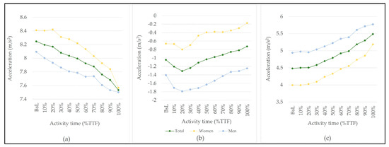The average acceleration showed different behavior depending on the axis of movement (Figure 3 and Table 2), with a progressive decrease on the X-axis, and an increase on the Z-axis. Regarding the Y-axis, there was an oscillation of acceleration throughout the activity, with the beginning of the activity (up to 20% of TTF) being characterized by a decrease in acceleration and then an increase until the end of the activity. Sex-related significant differences were only found in the Z-axis for the baseline and 10%TTF.