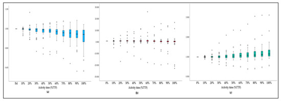 Figure 4. Acceleration ratio variation in (a) the X-axis; (b) the Y-axis; and (c) the Z-axis alongside the activity time. Values more than three IQR´s from the end of the box are labeled as extreme cases and denoted with an asterisk (*). Values more than 1.5 IQR´s but less than 3 IQR´s from the end of the box are labeled as outliers (o).