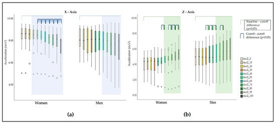 When looking for sex-related differences (Table 4 and Figure 5), we noticed that differences between cutoffs in the X-axis were significant only in the women and in the 40–50% and subsequent cutoffs. In the Z-axis, differences were found for the women in the second half of the activity, starting from the 50–60% cutoff, though in the men, significant differences were found from the 30–40% cutoff to the 50–60% and in the 70–80% cutoff.