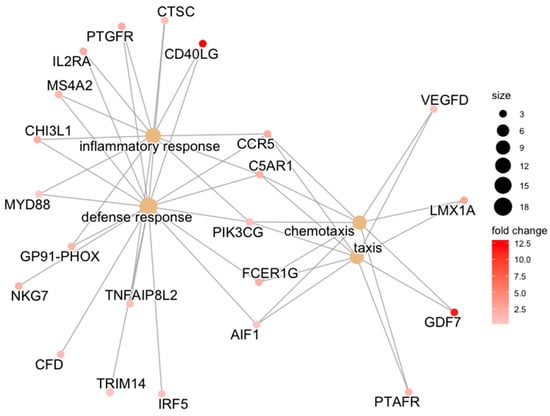 | chemotaxis | GDF7/FCER1G/C5AR1/CCR5/LMX1A/PTAFR/AIF1/PIK3CG/VEGFD | 0.046 | |