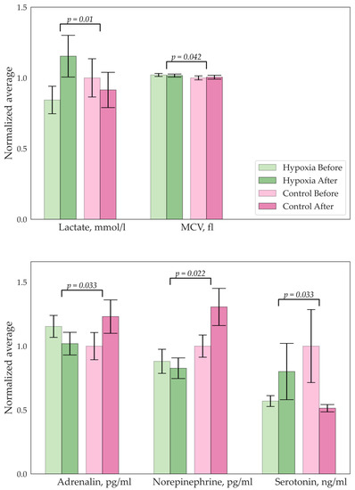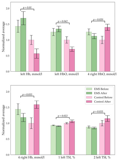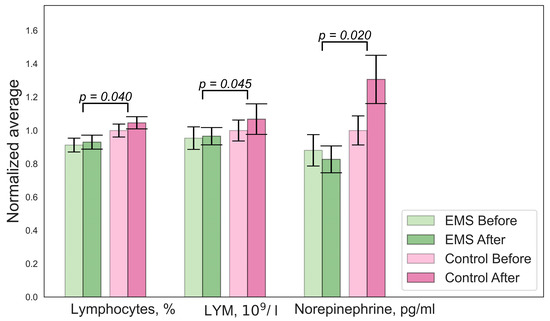 Figure 1, Figure 2, Figure 3 and Figure 4 illustrate the results of the statistical analysis. The graphs below show the normalized mean values of the indicators for the group before and after. The error bars indicate the standard error of the mean (SEM). Figure 1 shows changes in the biochemistry of the EMS group.