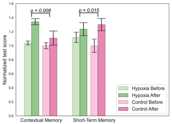 An increase in contextual memory was found in the hypoxic group, as shown in Figure 4. The participants from this group also showed higher scores on the short-term memory test compared to the beginning, but this increase was smaller than in the control group.
