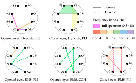 The participants in the EMS group experienced a decline in functional connectivity during the open-eye state, while the participants in the hypoxic group showed an increase in functional connectivity. In particular, the EMS group showed a decrease in coherence in the beta-1 frequency range for several channel pairs with open eyes and a decrease in PLI for the central and left regions in the theta range. On the other hand, the hypoxic group demonstrated an increase in PLI in the frontal region with closed eyes in the beta-1 frequency range.