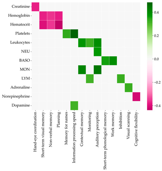 The correlations of biochemistry and cognitive parameters were calculated for pretraining data to exclude their influence. The Spearman coefficients are shown in color on the heatmap in Figure 7. The higher concentrations of creatinine, hemoglobin, hematocrit, and norepinephrine meant lower scores for the corresponding cognitive abilities. Other biochemistry parameters were positively correlated with the relevant test scores.