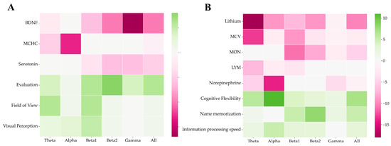 Spearman’s rank correlations between cognitive and biochemical parameters and FC in the open-eye state (A) and in closed-eye state (B) before the experiment. The FC was calculated using the coherence method.