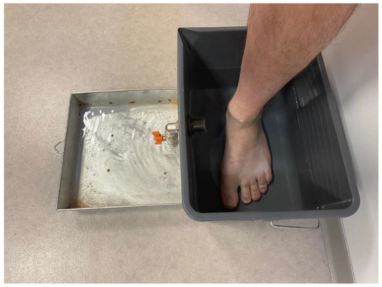 - Measuring foot and ankle volume by water displacement, or water volumetry, remains the reference method [20,21,22]. Some authors use inverse water volumetry [23], which consists of placing a dry foot in a volumeter that has been filled up to a predetermined level. Foot volume is determined either by assessing the volume of water that overflows from the foot volumeter or by the volume of water that needs to be added after retracting the foot from the volumeter to return to initial water levels (“inverse” method). The advantages of water volumetry are practicability and reproducibility [22]. However, in daily clinical practice, managing water volumes, maintaining water hygiene, and taking time may represent significant issues. Moreover, immersing a limb with any kind of skin lesion in water is not advised.