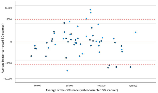 - The measurement discrepancy was 47.8 cm3, showing underestimation when using a 3D scanner versus water volumetry. After correcting the results yielded by the 3D scanner method for this value (“corrected 3D scanner measurement, in which the measurement discrepancy of 47.8 cm3 was considered and normalized in the comparison of volume measurement between the two methods);