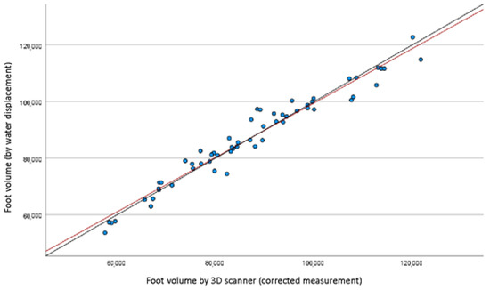 - The mean foot volume when measured by a 3D scanner was 821.9 +/− 162.6 cm3, versus 869.5 +/− 160.0 cm3 when using water-displacement volumetry (p < 10−5). The concordance of gross measurements, measured by Lin’s CCC, was 0.93, indicative of an excellent correlation between the two techniques. No deviation from normalcy was shown for the difference in measurement between water volume and scanner volume (p = 0.2), which allowed the application of the Bland and Altman method (Figure 3);