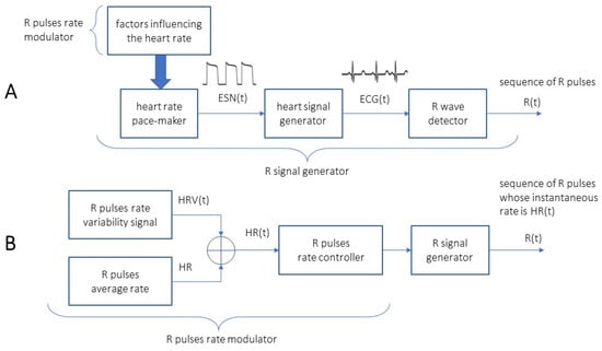 An abstract and almost black box model of the heart rate variability signal as a heart rate frequency modulator. (A) A black box model of any physiologic factor (R pulse rate modulator shown upper left) is blindly considered to impose a certain discharge frequency on the cells in the sinus node, which provide an electrical sinus node signal that propagates in the heart, and eventually will be responsible for producing an electrical signal recorded on the skin of the body. An external R-wave detector produces a signal that is zero at any instant of time, but when an R-wave is detected so its value is set to one (the detected R pulse). (B): The R pulse rate modulator is now black box modelled as an R pulse rate variability signal generator that produces a signal that is equal to the variation of the heart rate (over the average) at each instant of time . This signal is then summed to a constant value representing the average heart rate in the considered epoch to produce a signal that is equal to the heart rate at each instant of time . All of the time-domain signals indicated in the figure are assumed to be continuous in time.