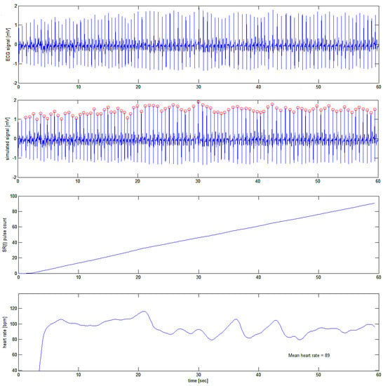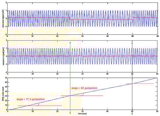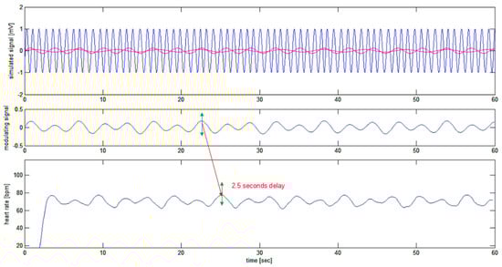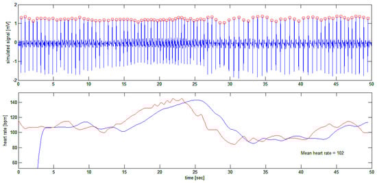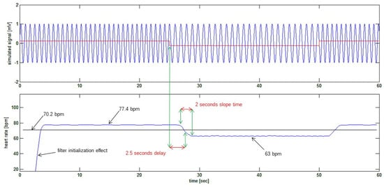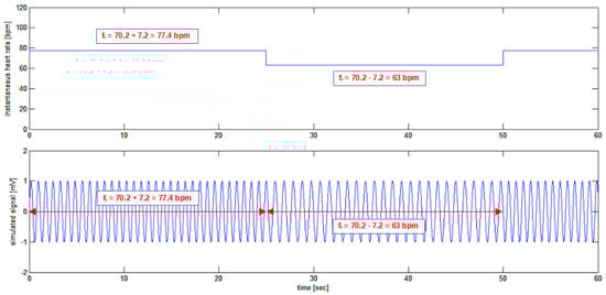 Finally, the heart rate signal can be plotted, as is shown in Figure 7. This figure shows how the recovered heart rate signal (bottom trace) closely resembles the simulated signal (top trace in red), which was used to modulate the frequency of the “sinusoidal ECG”. In particular, the step from 77.4 bpm to 63 bpm has been detected with a 2.5-s delay (known from the fixed delays applied by the filters), and the sudden step in the heart rate is detected with a 2-s gentle slope of the recovered signal, which is about two heart cycles in time length. The beginning of the reconstructed signal is affected by the initialization transition period of reconstructing filters or edge effects.