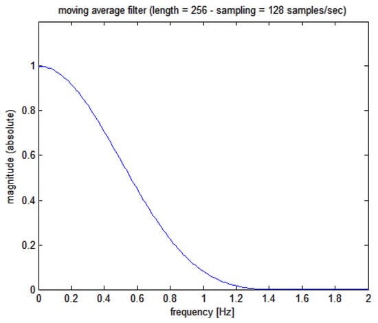 (a) Initially, the signal is low-pass filtered with a moving average 256 points on a Kaiser-Bessel weighted filter, whose Bode plot is shown in Figure 4 (corresponding, at the sampling frequency used of 128 Hz, to a 2 s epoch and giving a filter delay of 1 s (To recall a basic signal theory concept: the time delay for a FIR filter having N taps (points or coefficients) at a sampling frequency is equal to .))