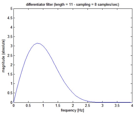 (c) Eventually, filtering is applied to the downsampled signal with a differentiating noise-robust filter to obtain the first derivative or the instantaneous heart rate signal; signal differentiation by FIR filtering is a classical procedure, and therefore the original and robust method proposed by Holoborodko [] was followed using an 11-order one-sided noise-robust differentiator whose Bode plot is shown in Figure 5; a filter delay of 625 ms is expected. This filter has a linear characteristic at low frequencies (implying a multiplication by the s-variable in the Laplace domain), while at higher frequencies it becomes a low pass.