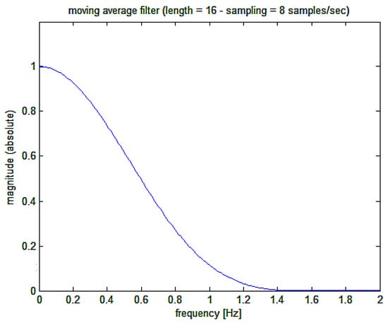 (d) A final low pass filter is then applied to the signal with a moving average Kaiser-Bessel 16-point weighted filter whose Bode plot is shown in Figure 6 (corresponding, at the sampling frequency of 8 Hz, to approximately 2 s and giving a filter delay of 937.5 ms); following the differentiating filter, which provides the required first derivative. This moving average filter is then used to clean the output from residuals of the original R-wave detection points (the original carrier frequency).