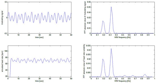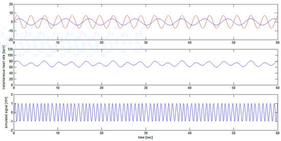 where is the constant average value of , and the function is the variable component or, more appropriately, the heart rate variability signal that was sought. In the example simulated in Figure 2, the following values are used: