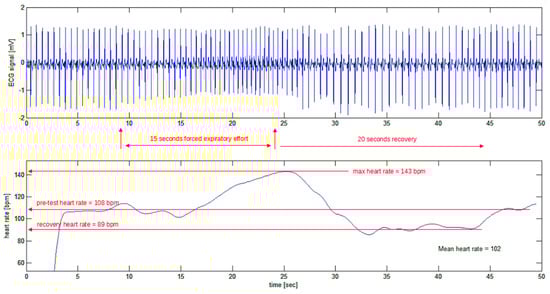 In Figure 12, a typical tracing is shown where the resting heart rate of the subject (one of the authors: H.K.) is 108 bpm. At the end of the forced expiratory effort, the heart rate went up to 143 bpm (or 35 bpm above the resting value). During the recovery phase, the heart rate went down to 89 bpm in just 7 s (or 54 bpm down with a negative slew rate of 8 bpm per second) before restoring the resting heart rate to 108 bpm.