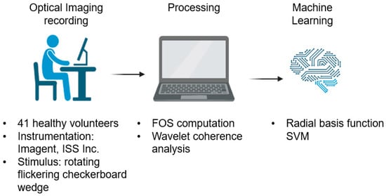 The ability to estimate a retinotopic map shows the high temporal resolution of FOS, making this method ideally suited for BCI applications based on visual stimuli. FOS has rarely been used to feed data-driven machine learning (ML) approaches to classify cortical activation and deliver a successful classification of brain signals. In BCI systems, ML techniques play a dominant role in data analysis since they help with learning, comprehending, and interpreting complex brain activities []. Among the variety of classifiers available, the support vector machine (SVM) has been demonstrated to be highly effective for classifying brain signals [,,,,,]. Proulx et al. (2018), for example, used SVM and Linear Discriminant Analysis (LDA) using FOS (light intensity and phase delay, a measure of average photons time of flight using frequency-domain NIR systems) to distinguish between unusual and common responses []. The outcomes were combined using a weighted majority vote. FOS responses to rare and common images were classified among participants either offline, obtaining an average balanced accuracy of 62.5%, or online, with an average balanced accuracy of 63.6% []. The current study aimed to investigate the capability of combining FOS with SVM for single-trial retinotopy estimation in BCI applications. In particular, features computed through a wavelet coherence procedure applied to FOS were used as input for an SVM classifier in order to provide a classification of the visual quadrants relying on single-trial recordings. Figure 1 reports the block diagram of the proposed method.