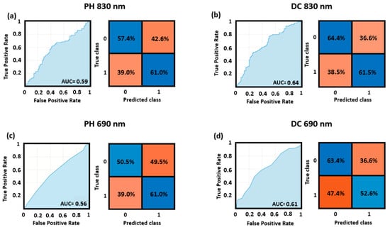 Figure 5 reports the ROC curves and the confusion matrices for the best cutoff point delivered by the cross-validated classification of the right and left quadrants for the DC and PH at 830 nm and 690 nm wavelengths. The results refer to the whole study sample. The model fed with the features computed from the DC at 830 nm yielded the highest AUC (0.64), while the model fed with the features computed from the PH at 830 nm yielded the lowest AUC (0.55).
