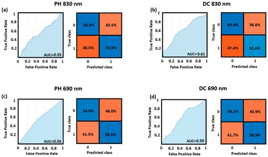 ROC curves and confusion matrices for the top vs. bottom quadrants’ classification obtained through SVM applied to (a) PH of the 830 nm wavelength, (b) DC of the 830 nm wavelength, (c) PH of the 690 nm wavelength, and (d) DC of the 690 nm wavelength.