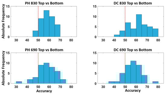 Figure 4 reports the ROC curves and the confusion matrices for the optimized cutoff point obtained for the cross-validated classification performance of the top and bottom quadrants, for both the DC and PH at 830 nm and 690 nm wavelengths. The higher AUC (AUC = 0.64) was obtained by the model fed using the features computed from the DC at 830 nm, whereas the lower AUC was obtained by the model taking as input the features from the PH at 690 nm (AUC = 0.56). Note that all these values refer to the whole sample of 41 participants.