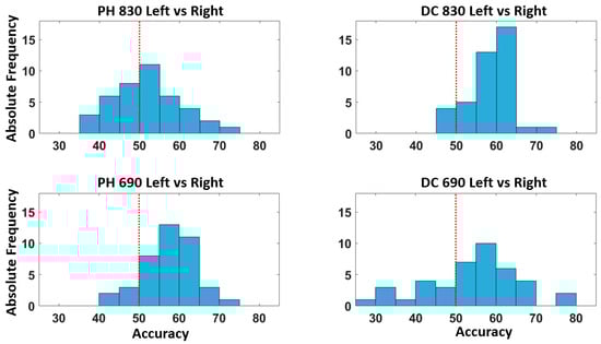 Figure 7 depicts the accuracy distribution associated with the left vs. right quadrants’ classification for each optical signal taken into consideration. Additionally in this case, the model provides a classification accuracy above chance for most of the participants.