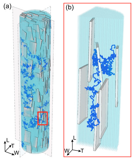 The geometrical model represents a MCF with a mineralization degree of 32%, in agreement with previous studies [41,49]. The RW model is implemented on an MCF configuration achieved after roughly 6·106 random inclinations and rotations of the platelets. We performed random displacements and rotations for each apatite platelet in order to better mimic the structure of bone tissue at the nanoscale. We started from a perfectly aligned configuration of apatite platelets and performed random perturbations to achieve inclinations for each apatite crystal, in agreement with the range available in the literature [50,51], i.e., within ±20 degrees. The method is described in detail in a previous study [42].