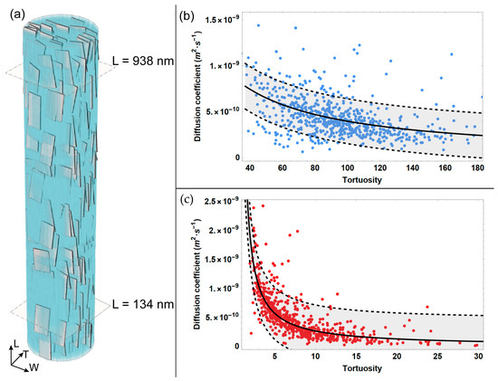 Diffusion coefficient achieved from MSD data analysis versus tortuosity for two reference quotes (a) that are characterized by minimum (c) and maximum (b) values of tortuosity. The light grey bands in (b,c) represent the confidence interval at 95%.
