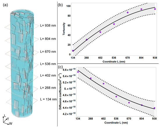 (a) Equatorial planes depicted correspondingto each reference plane considered in the longitudinal direction of the MCF. Average tortuosity (b) and average diffusion coefficient (c) are represented as a function of the reference quote in the longitudinal (L) direction. The light grey bands in (b,c) represent the confidence interval at 95%.